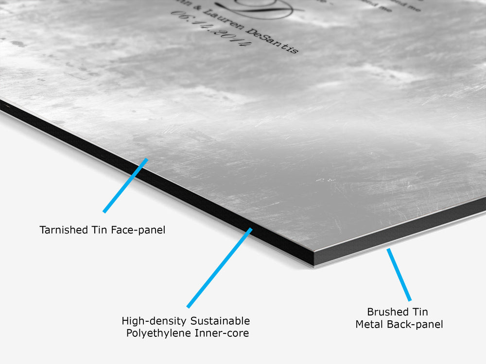• Each sign is comprised of two brushed-metal panels (front-facing and backing) bonded to a solid polyethylene core in a continuous extrusion process.