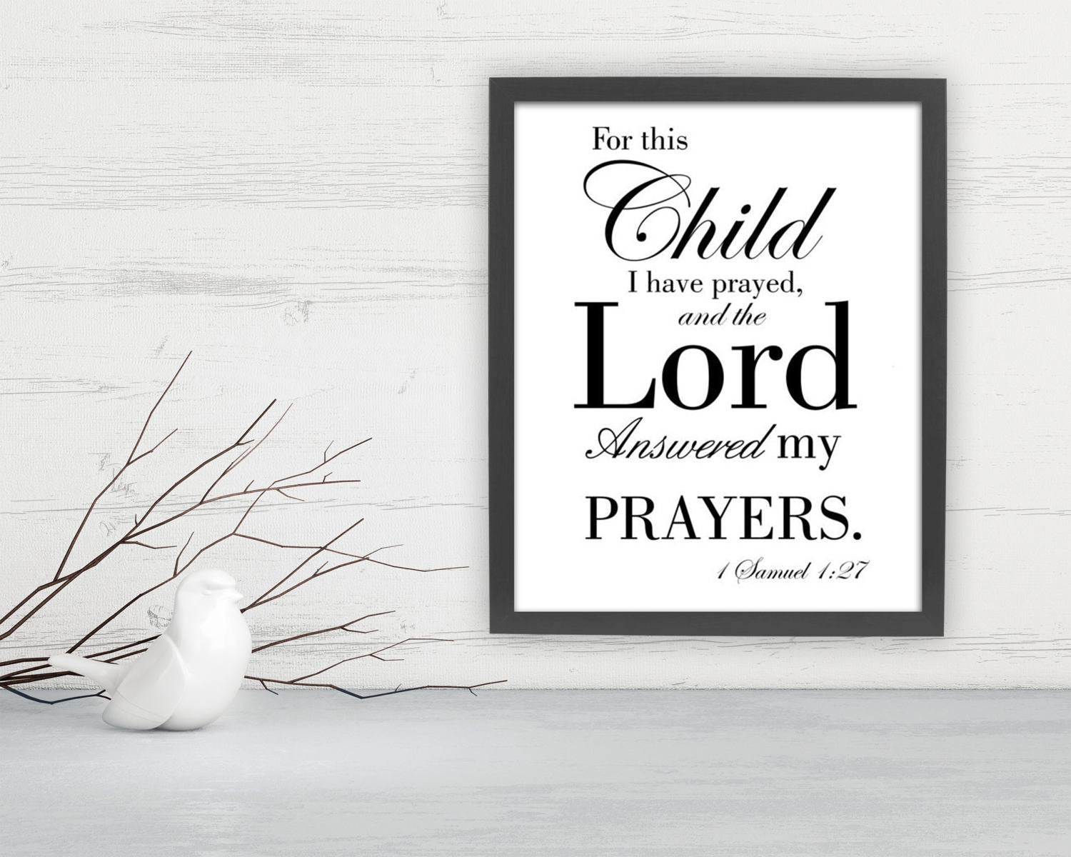 For this child I have prayed and the Lord has answered my prayers. Some of us want nothing more than to have a child - 1 Samuel 1:27 is a beautiful reminder of God's faithfulness. The simple yet elegant bible verse typography makes a classy addition to any wall - home or office. This scripture design is the perfect gift for expectant parents, couples adopting a child, first-time moms, or anyone welcoming a brand new baby into their home. It's Christian-themed typography that is ready to print and frame, dedicated to inspire those who read it with its biblical truth, With formal typefaces in basic black arranged delicately on a pure white canvas, this bible verse word art makes an especially popular scripture wall décor for baby's room or nursery.