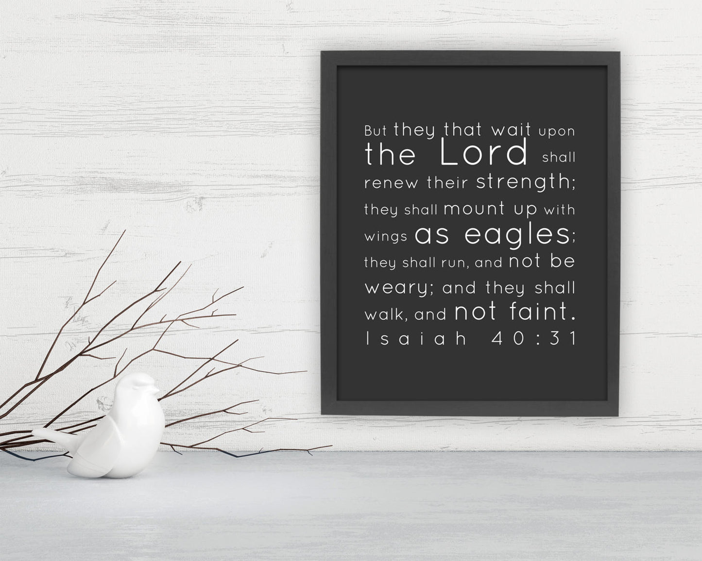 A beautiful typography design featuring Isaiah 40:31, printed on museum quality fine art giclee paper and professionally framed. This scripture wall art works for any space and makes an excellent gift for friends, loved ones and family as well as pastors and church members.