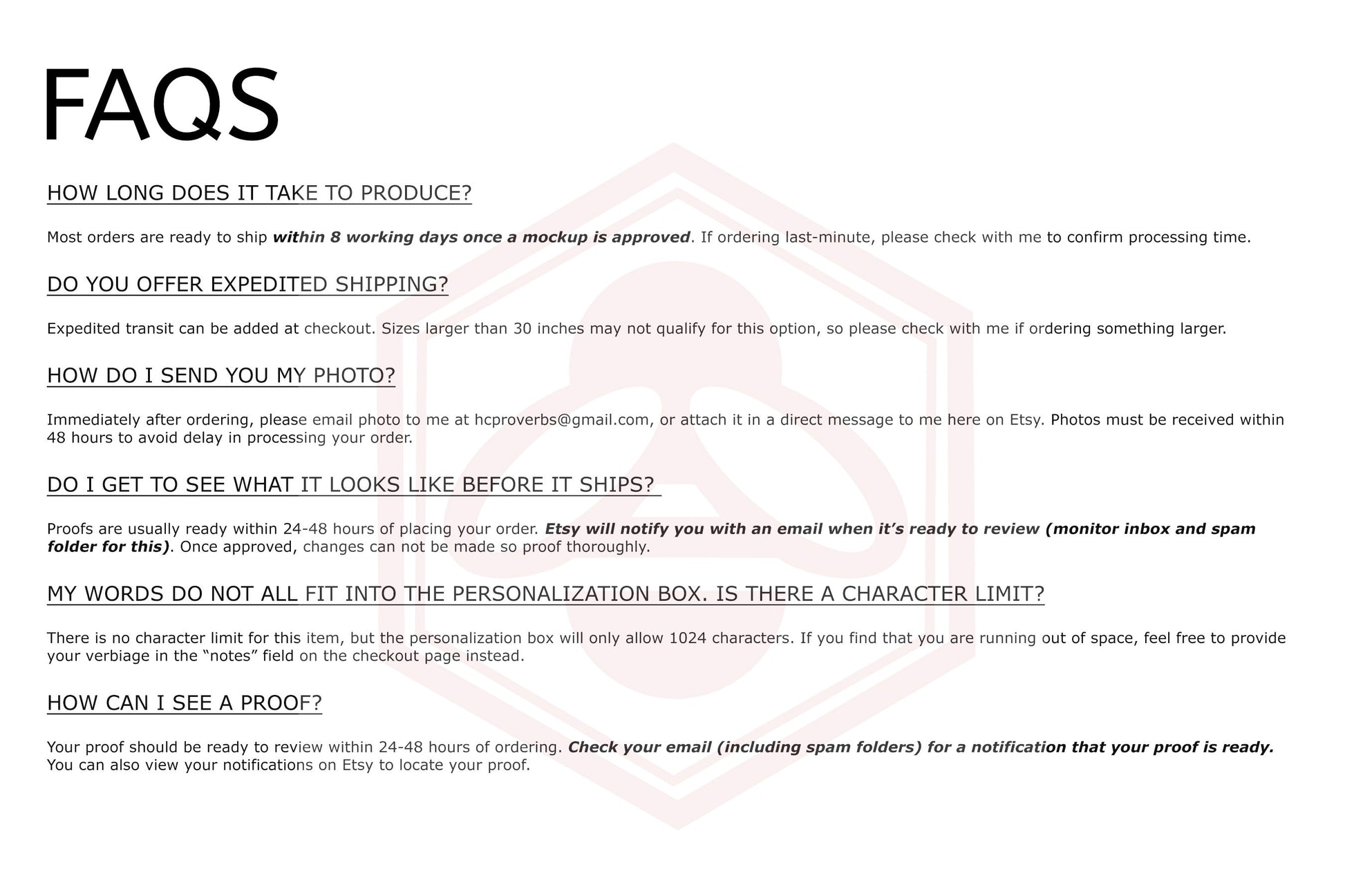 Wedding Vows or other wording:Provide the wording or vows in the personalized field before adding to cart. If you prefer to send the wording via email, please include your order number in the subject line and email us at cs@hunnycombproverbs.com