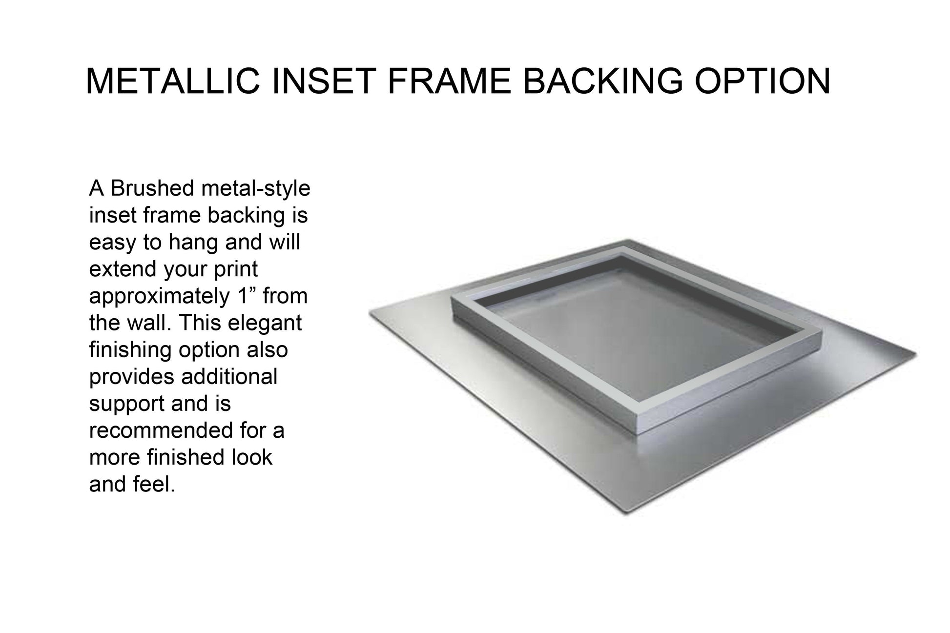 • Two hanging options: Choose from Gatorboard Float backing for an economical hanger, or Metallic Inset-Frame backing for a more finished look and feel.