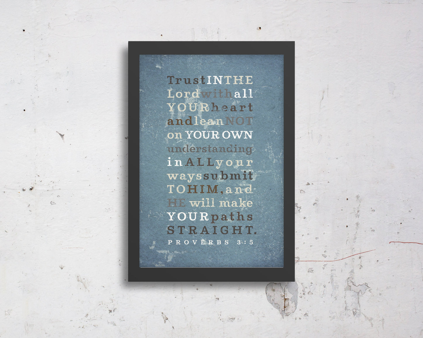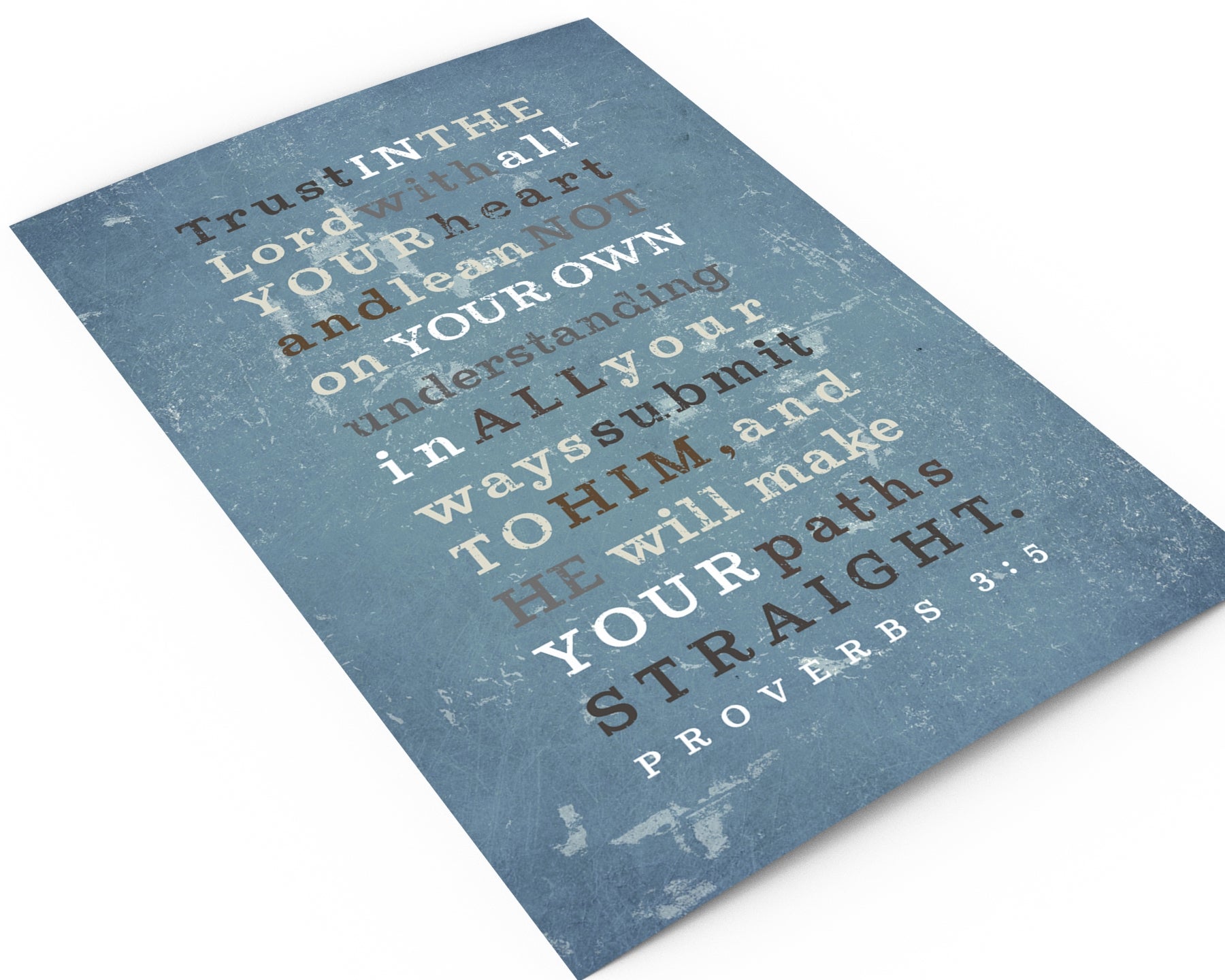 Order this grunge style scripture art design, featuring Proverbs 3:5, or, customize this to feature any wording or scripture.