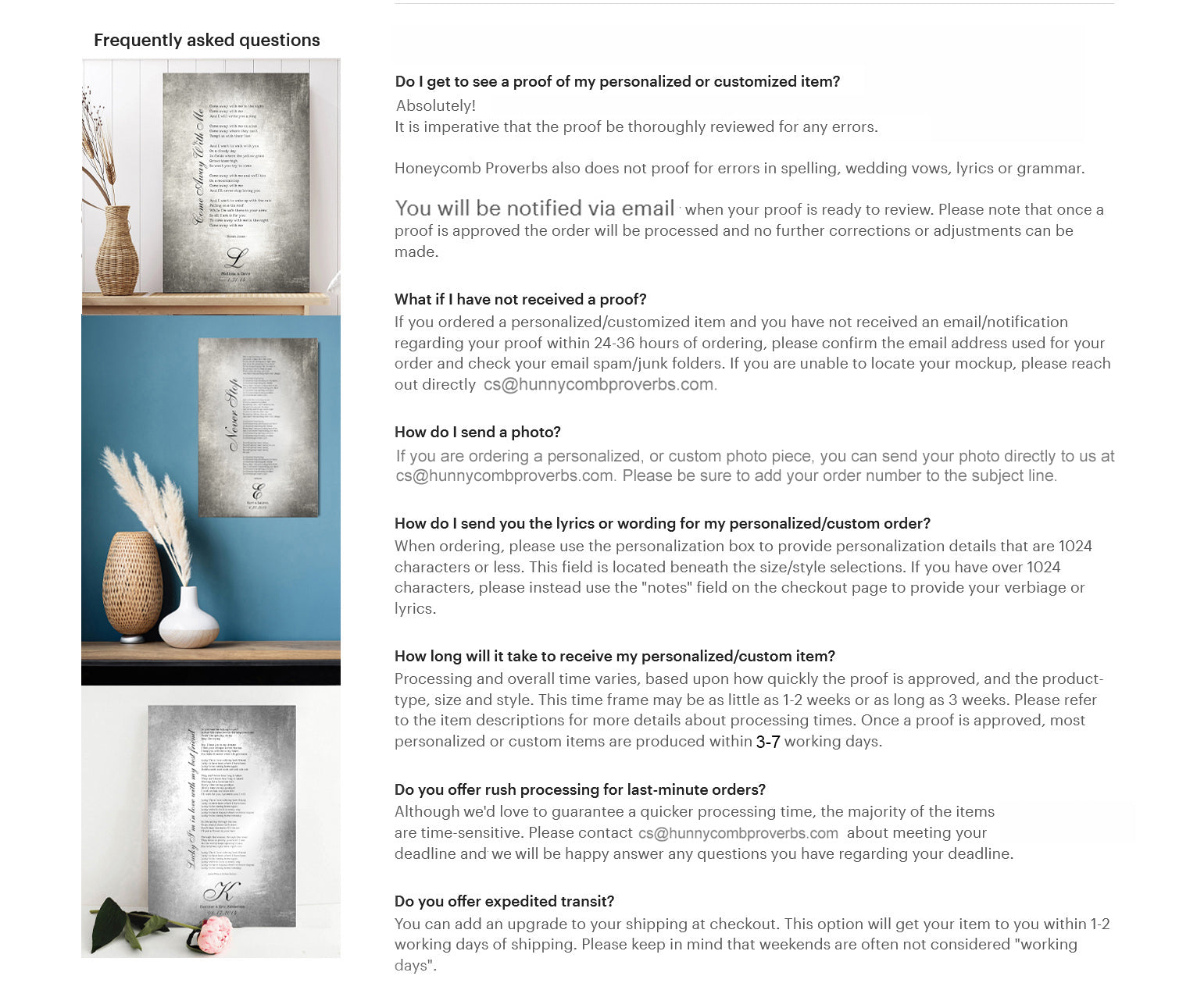 Wedding Vows or other wording:Provide the wording or vows in the personalized field before adding to cart. If you prefer to send the wording via email, please include your order number in the subject line and email us at cs@hunnycombproverbs.com