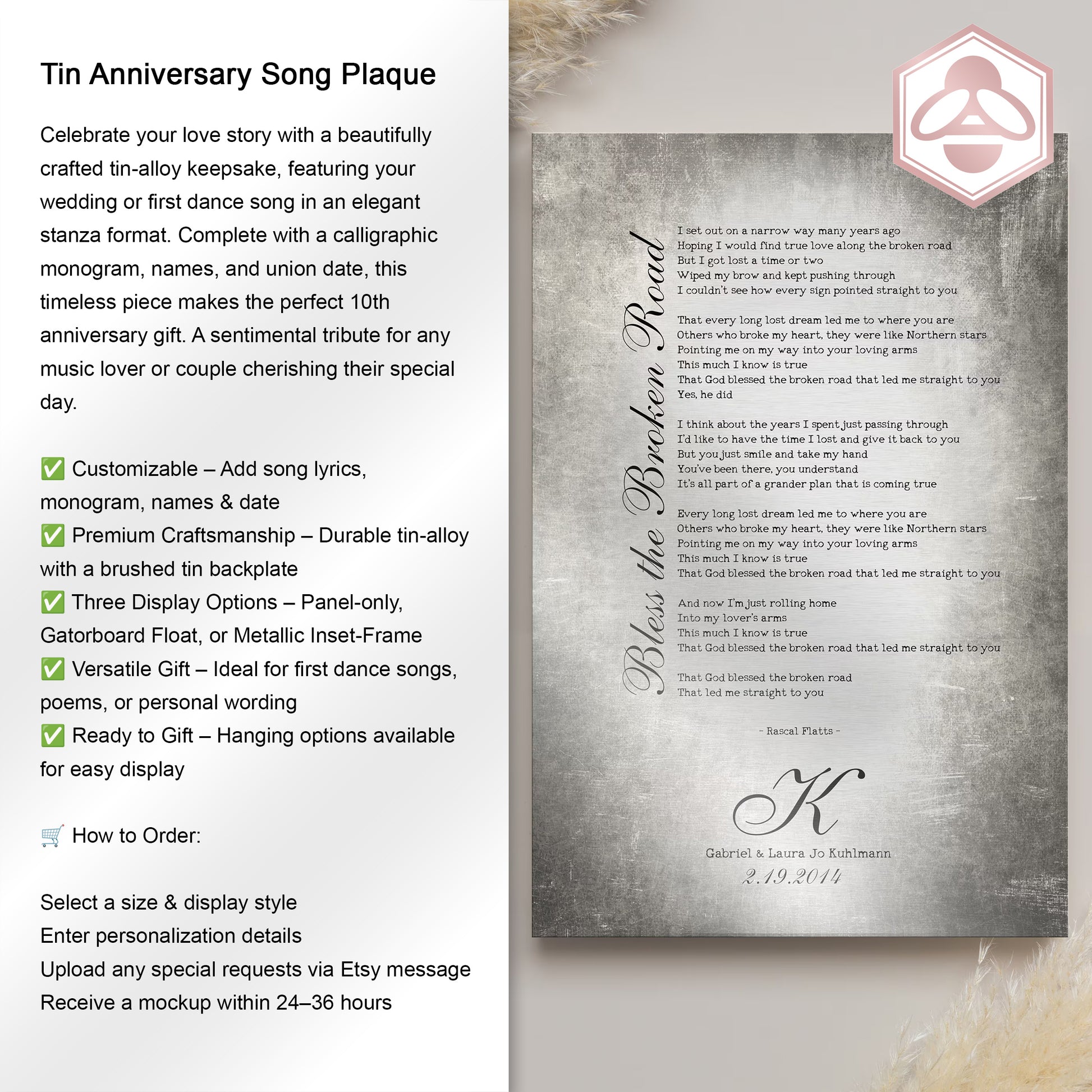 Tin, 10 year wedding anniversary gift - Rustic, industrial farmhouse style custom wall decor. This aluminum/metal print is personalized with your song or wording, and also features names and dates to create the perfect custom-made tin anniversary gift. Perfect for the new couple, or as a tin gift for 10th anniversary. Choose from 3 display options. Ready to hang options available for a gift that's ready to display, right out of the box.