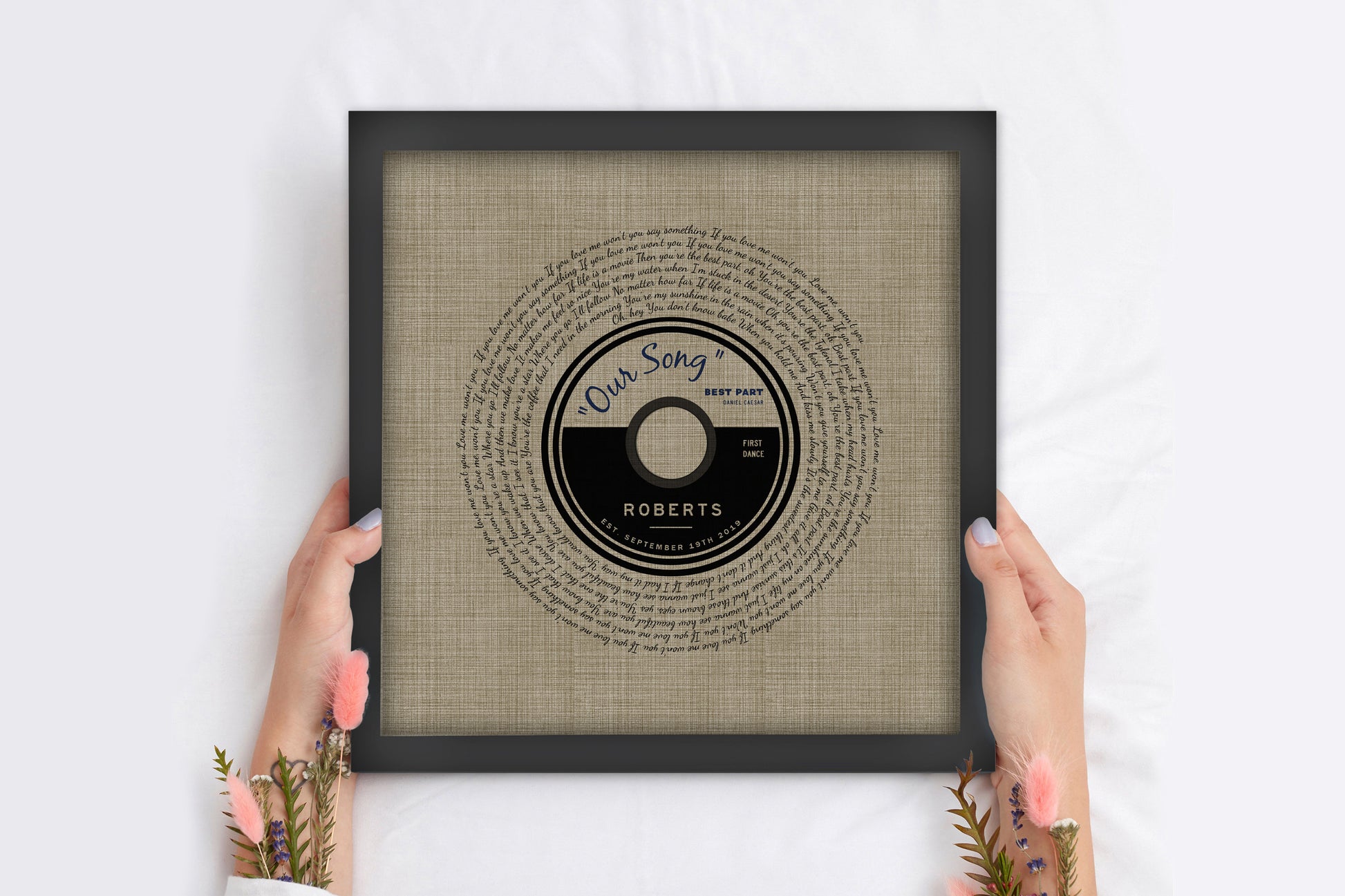 The perfect gift for your 4th wedding anniversary. Fun vinyl design simulates an actual record. Combine your first dance song lyrics with linen for a beautiful and timeless gift. Professionally framed and ready to give or hang, your personalized record print on linen includes the song of your choice with the couple's names and union date. This handcrafted piece is printed directly onto Belgian Linen. This rustic anniversary or wedding gift also makes a great announcement piece to hang at a wedding reception.