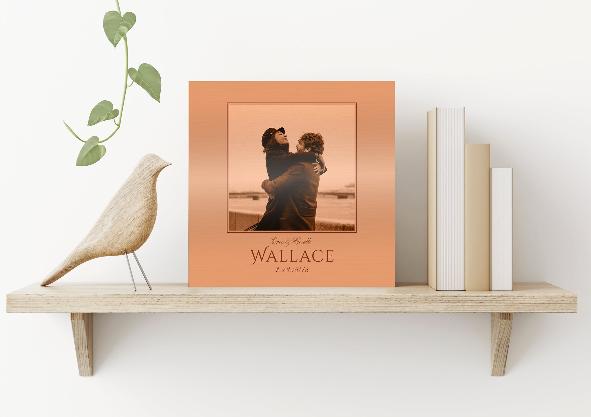 Personalized Copper Photo Gift for 7th anniversary. Celebrate 7 Years! Copper photo anniversary gift featuring the photo of your choice, and marked with the couple's names and union date. Industrial, and distressed-style copper photo gifts are sure to impress. This piece is modern and rustic all at the same time. Makes a great anniversary gift for him or her. This custom keepsake on metal fits beautifully in any space. This year, give a unique and meaningful 7 year anniversary gift or wedding gift. Just provide the names, wedding date, pick a font style and add one to your cart. Makes a perfect "copper" anniversary gift too! Each piece is a blend of aluminum/tin and made from 100% recycled materials.