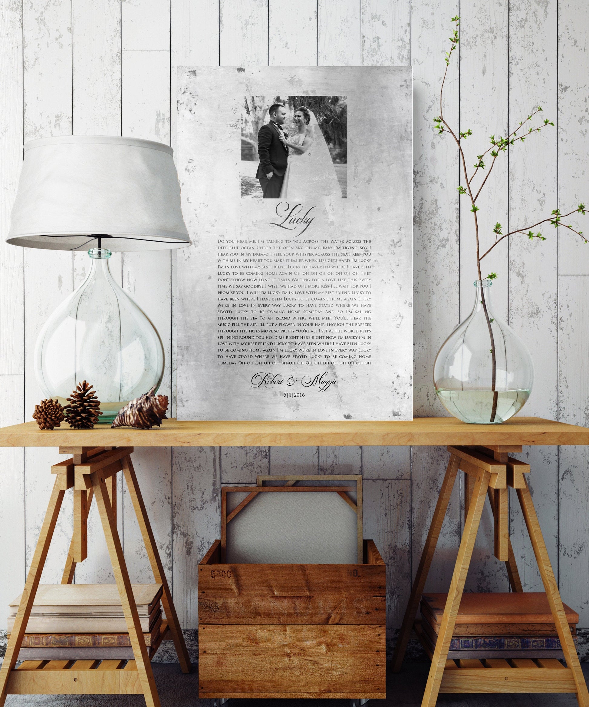 Personalized 10th anniversary gift. Wedding song on Tin with photo. Rustic, industrial farmhouse style custom wall decor. This aluminum/metal print is personalized with your song or wording, and also features names and dates to create the perfect custom-made tin anniversary gift. Perfect for the new couple, or as a tin gift for 10th anniversary. Choose from 3 display options. Ready to hang options available for a gift that's ready to display, right out of the box.