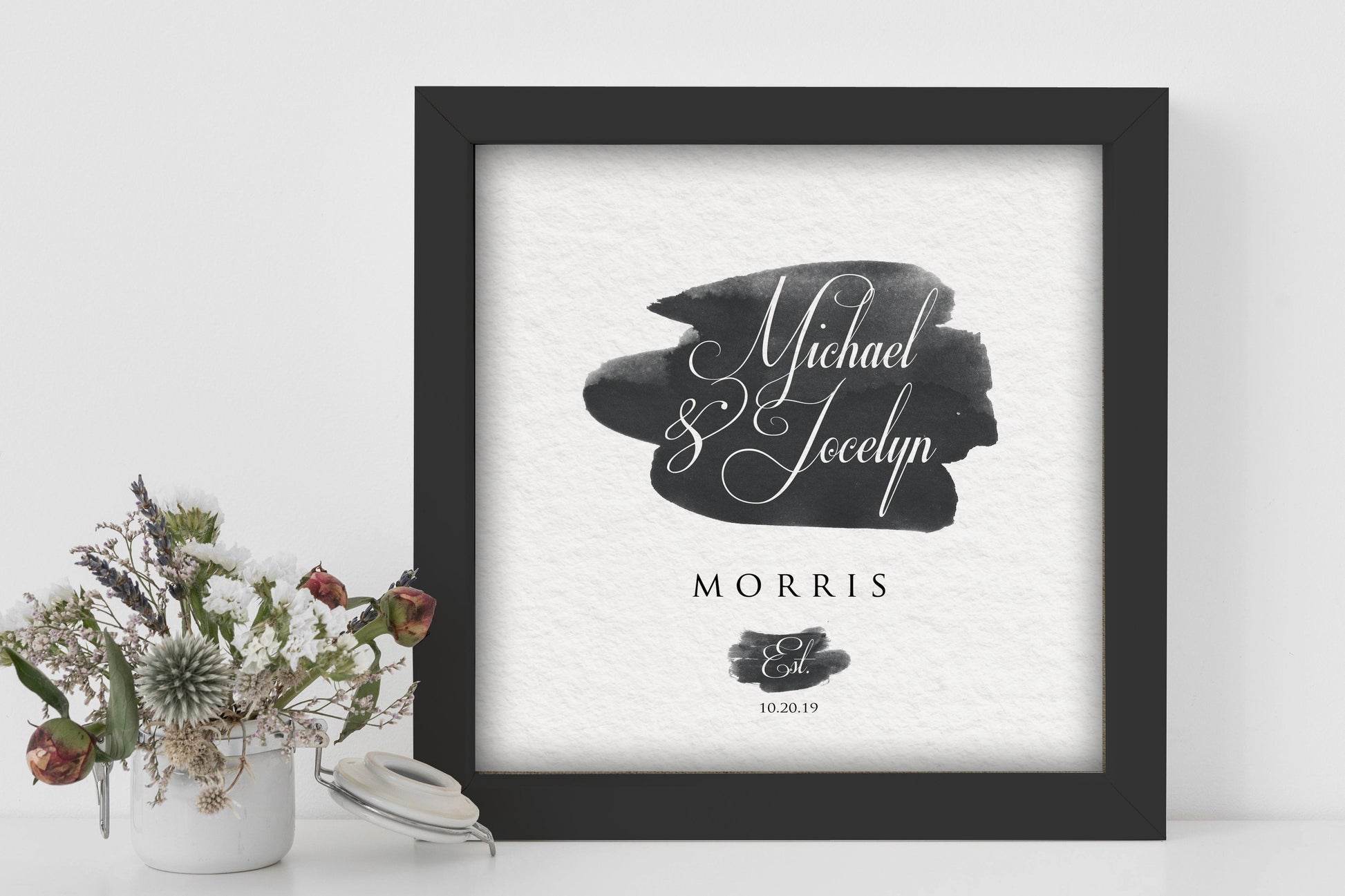 Wedding Date Art meets Boho with this personalized framed wedding date art. This handcrafted piece features the couple's names and wedding date and a watercolor swash- printed directly onto museum quality, Fine Art Giclee paper. This minimalist anniversary or wedding gift also makes a great announcement piece to hang at a wedding reception.