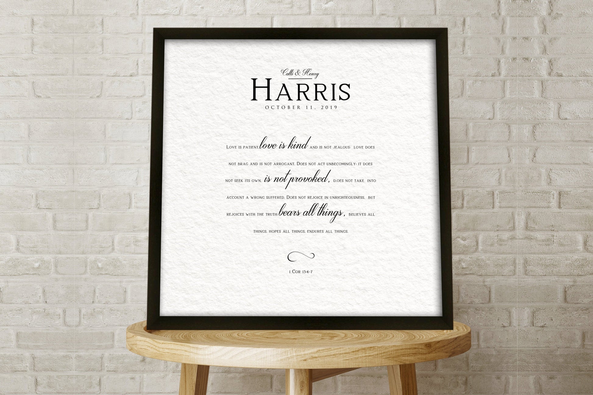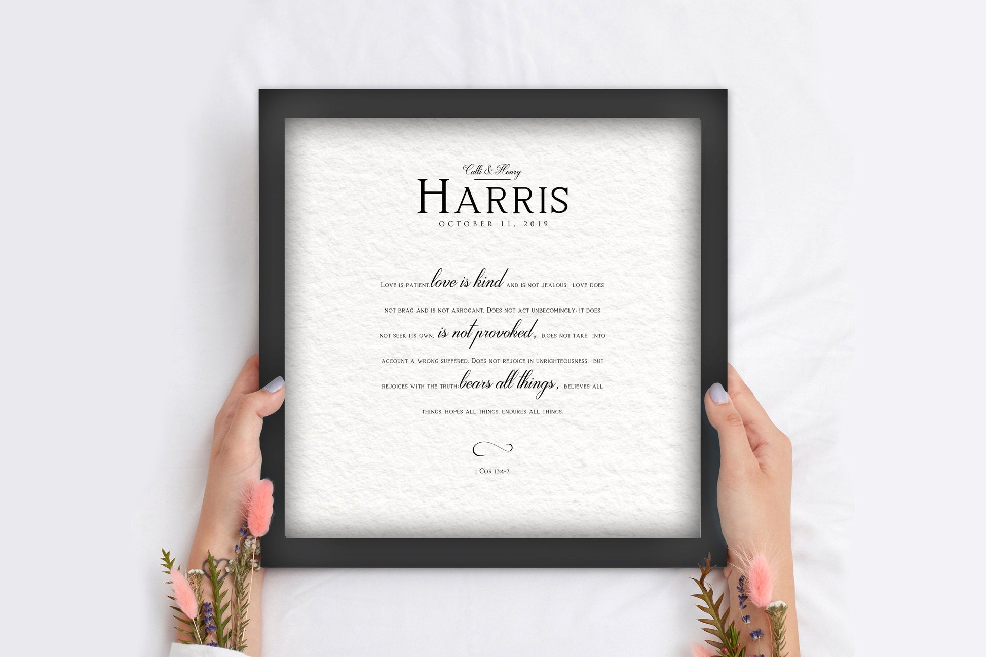 Framed marriage reading of 1 Corinthians 13:4-7. This framed wedding gift is personalized with the couple's first and last name and their wedding date. This handcrafted piece features the ever popular Love is Patient reading- printed directly onto museum quality, Fine Art Giclee paper. This minimalist anniversary or wedding gift also makes a great announcement piece to hang at a wedding reception.