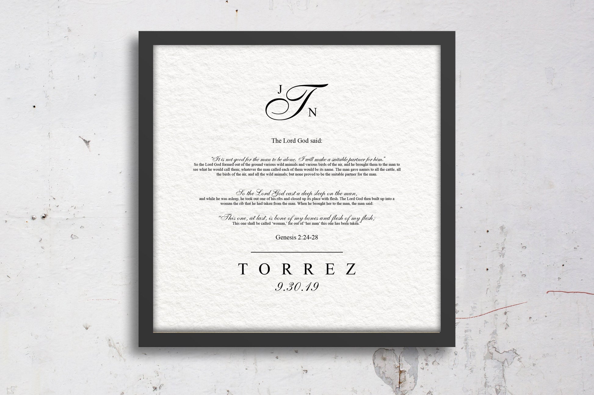 This monogrammed scripture gift is heartfelt and timeless, printed on beautifully textured archival fine art paper. Featuring Gen 2:24-28 and the beautiful verse, “This is now bone of my bones and flesh of my flesh; she shall be called ‘woman,’ for she was taken out of man.” Perfect for Catholic or Christian couples. Include the couples first and last initials and the date of their union for a personalized gift they will treasure for the rest of their lives.