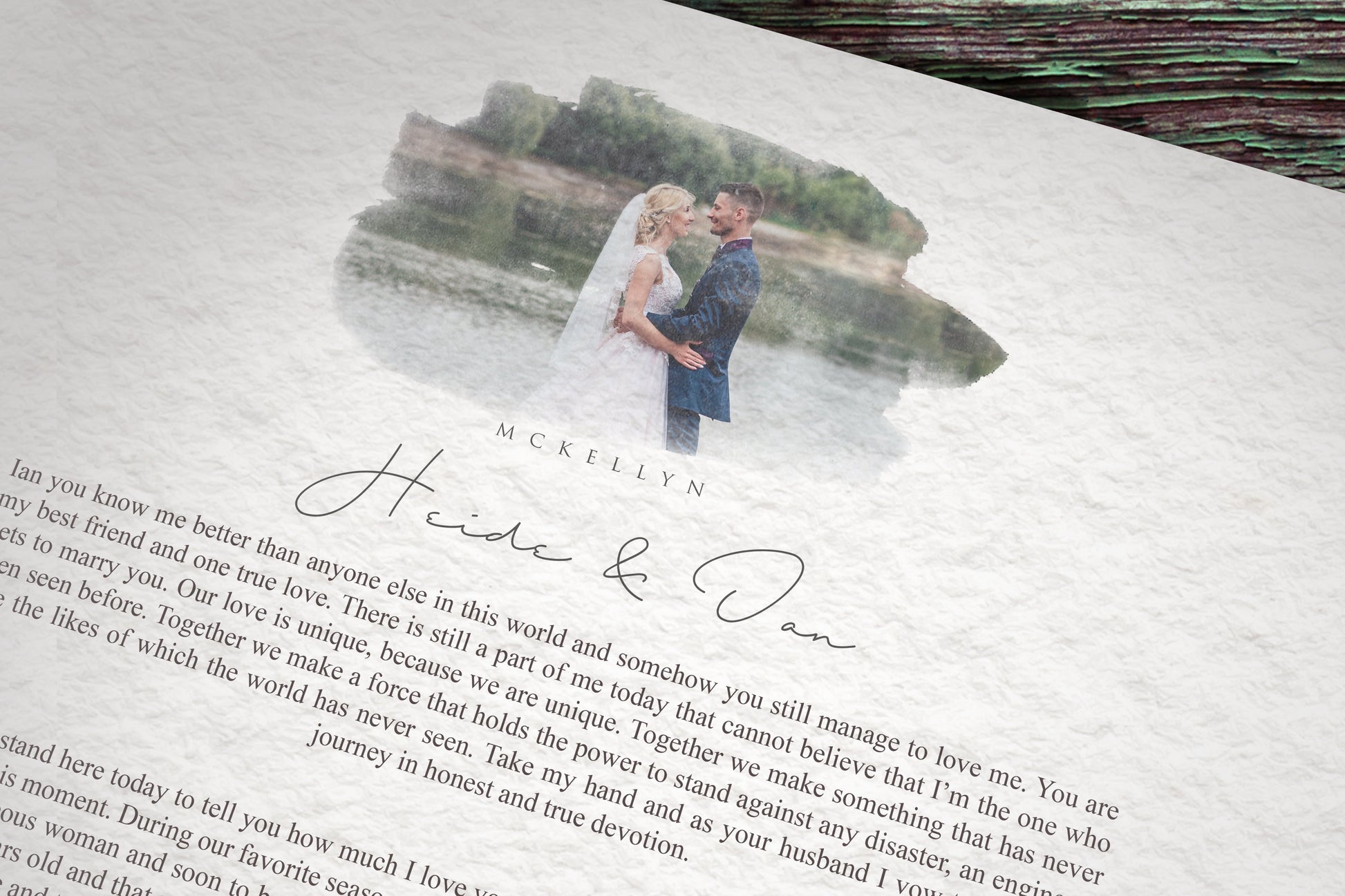 Paper Anniversary Gift for her - the perfect 1 year gift for wife. This Wedding Vow Art combines a beautiful watercolor swath with your photo for a chic, delicate style that goes perfectly with your wedding vows. Boho meets traditional for a style that fits any space. For a unique and romantic paper gift for her - personalized and professionally framed and finished. Paper Gift for your first anniversary featuring his and her wedding vows, names and date. Delicate calligraphy design on museum quality, textured fine art paper goes well in any space. Fits two sets of wedding vows. 1 Year Anniversary Gift for Husband, Calligraphy Wedding Vows, Printed Vow Art, Anniversary Gift, Paper Gift for 1 year