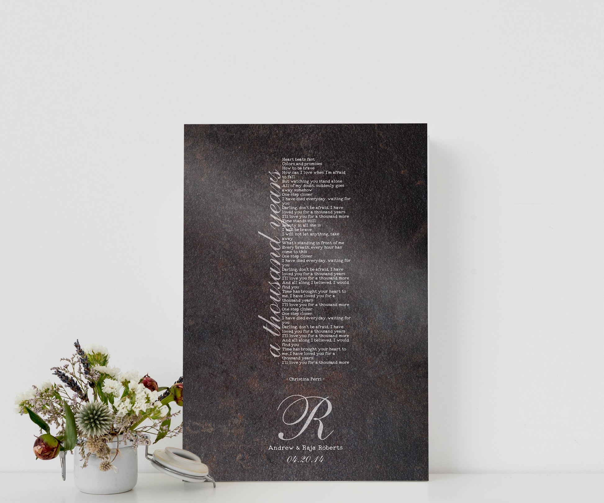 Wedding song on iron alloy aluminum - Rustic and romantic custom wall decor makes the perfect 6th anniversary iron gift. This iron/aluminum blend keepsake is personalized with your song or wording, and also features names and dates to create the perfect custom-made iron anniversary gift. Perfect for the new couple, or as a tin gift for 10th anniversary. Choose from 3 display options. Ready to hang options available for a gift that's ready to display, right out of the box.