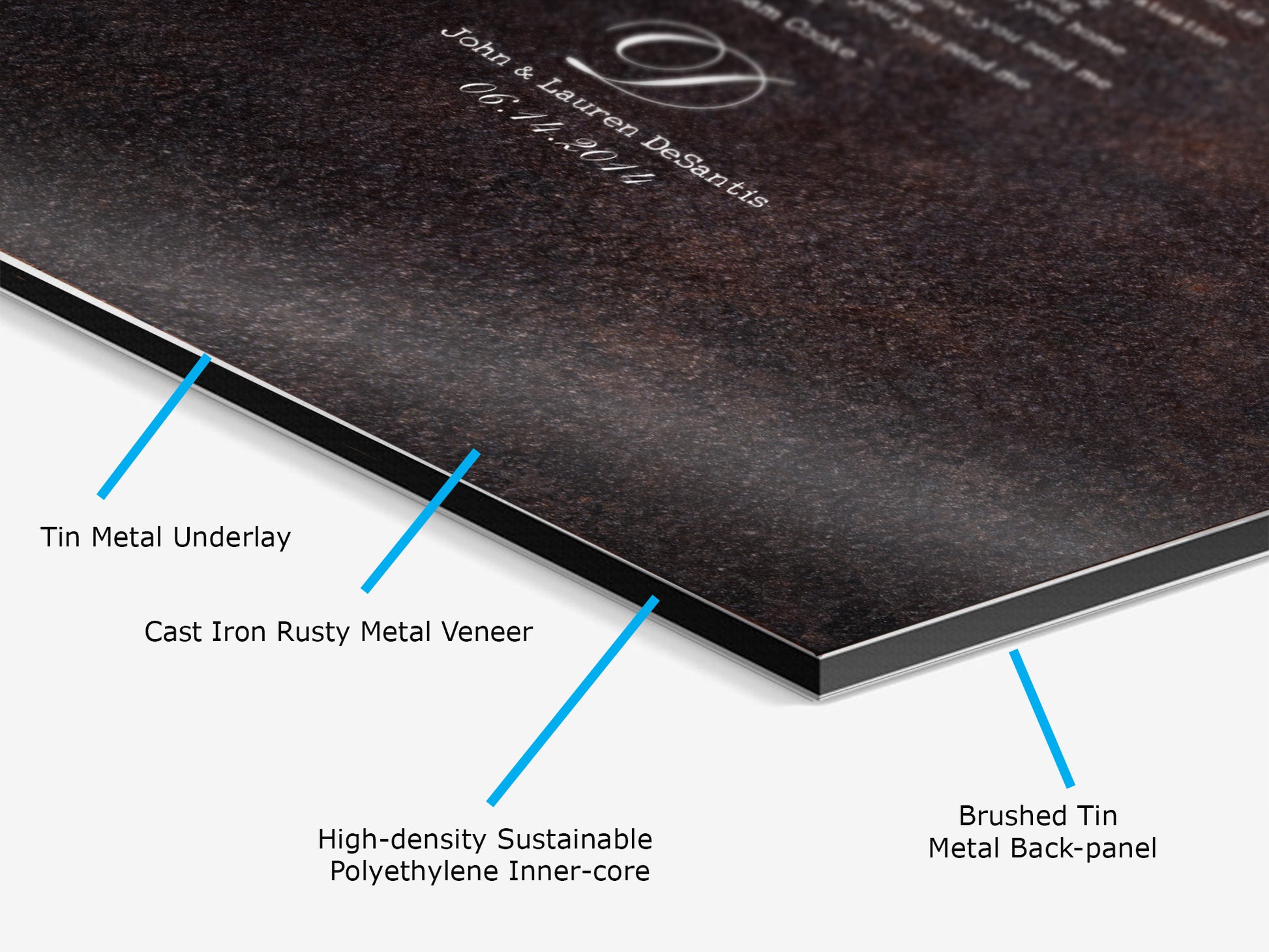 • Iron-alloy veneer, bonded to a aluminum face-plate, and fused to a solid polyethylene core in a continuous extrusion process with a brushed aluminum back-plate for a clean finished look