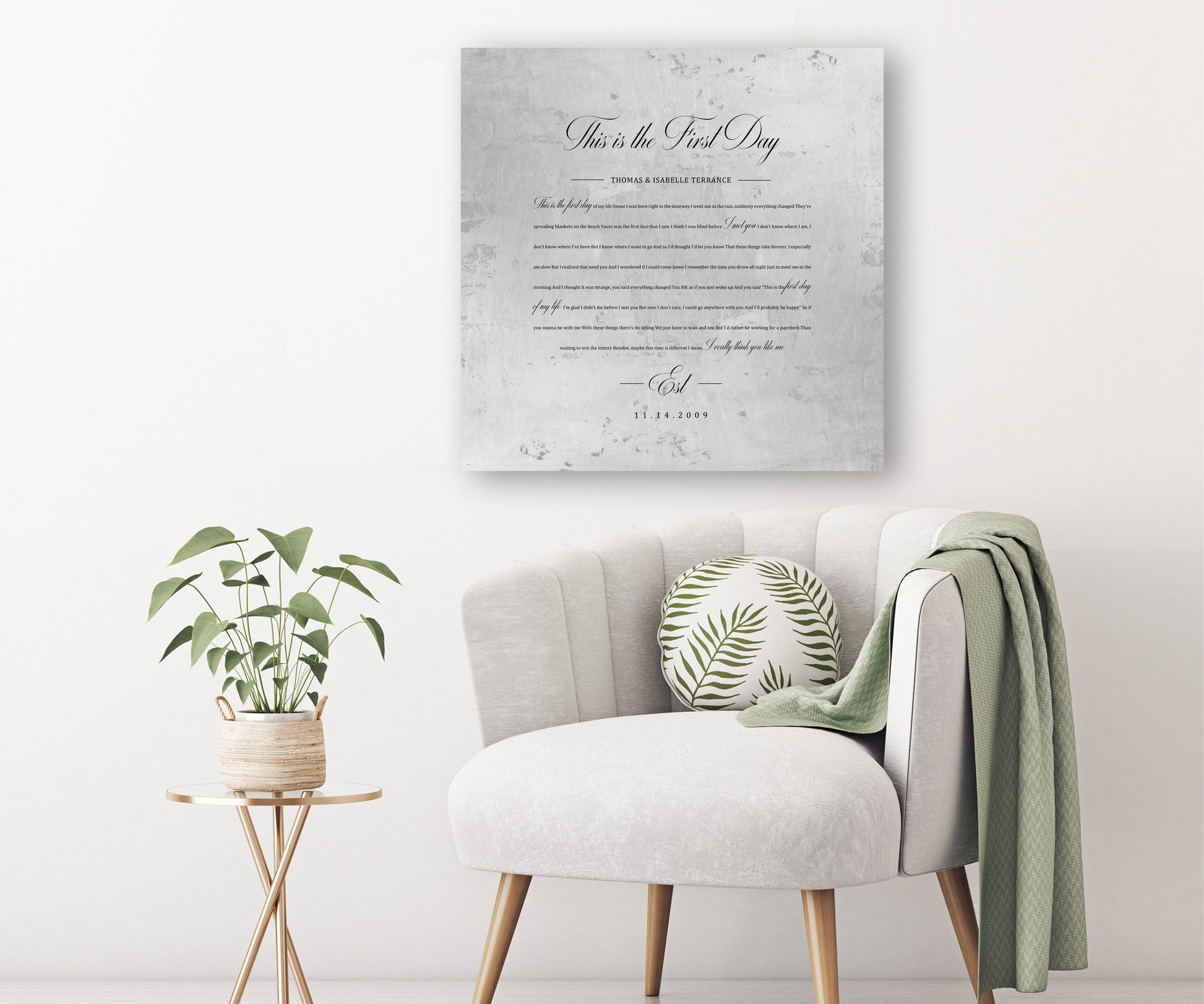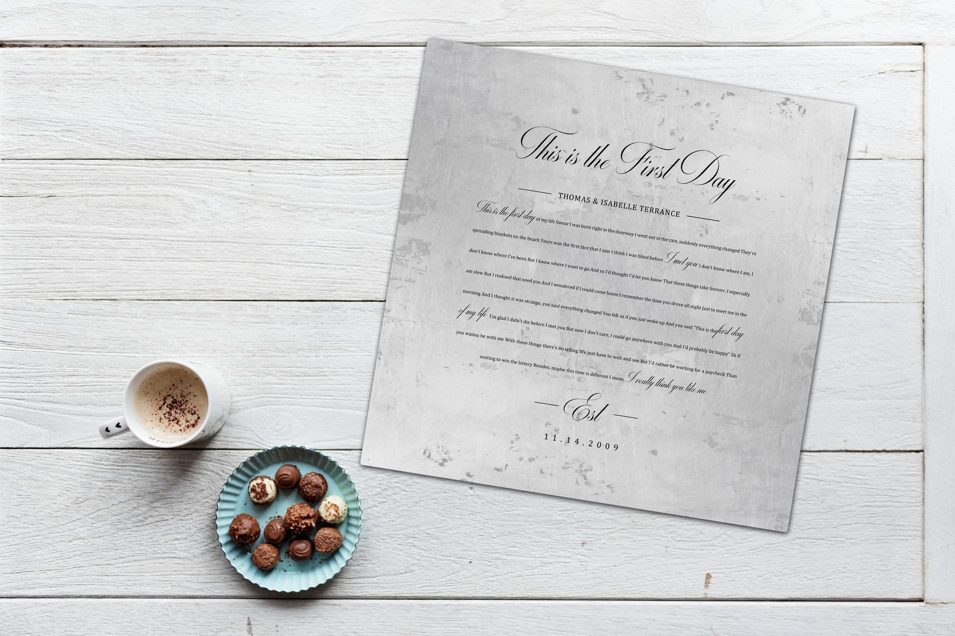 Modern and minimalist, with a rustic and distressed look - this custom song print on metal fits beautifully in any space. Printed wedding song, first dance song lyrics or even wedding vows on a tin/aluminum panel make a meaningful 20 year anniversary gift or wedding gift. Just provide your wording/lyrics, pick a font style and add one to your cart. Makes a perfect "tin" anniversary gift for your ten year wedding anniversary!